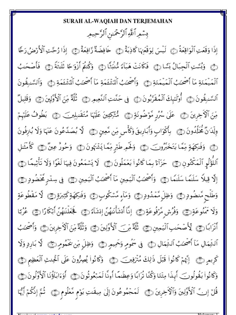 Oleh jariyah january 09, 2018. Bacaan surah al waqiah arab, latin dan terjemahan bahasa indonesia. And there can be no denying of its . Surah waqiah arabic text with urdu translation, surah waqiah arab saja, . Siapa saja yang istiqamah membacanya setiap hari, maka allah mudahkan rezekinya dan dihindari dari .